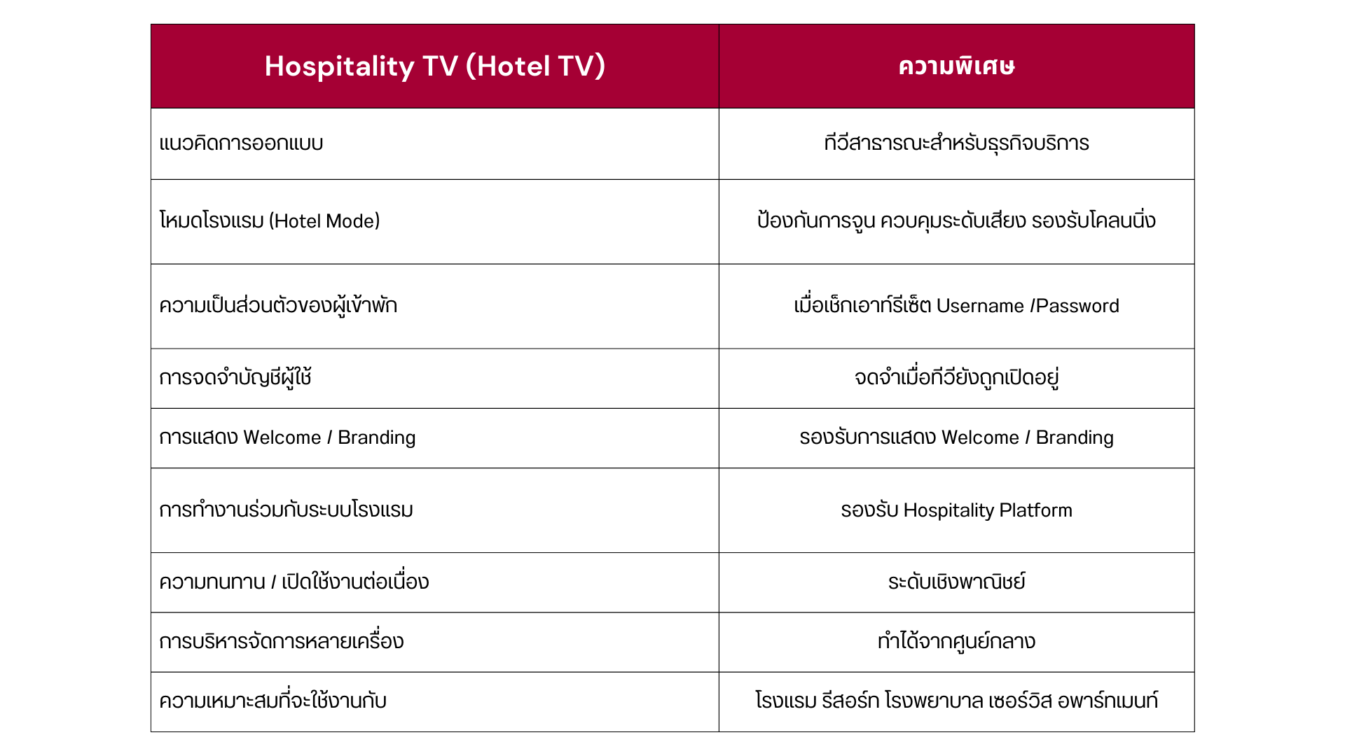 ตารางสรุปความพิเศษของ Hospitality TV (Hotel TV)