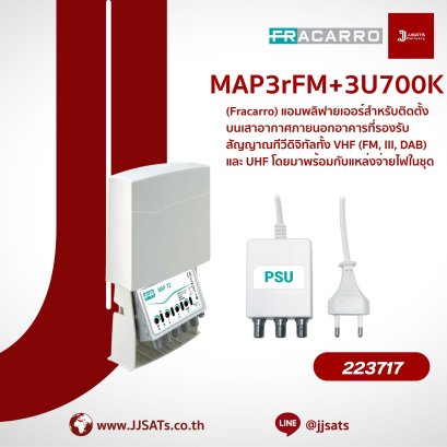 Fracarro MAP3rFM+3U700K (223717) KIT with power supply 2-input (FM+III+DAB, UHF) mast amplifier with 28dB gain and up to 116dBμV output level on UHF band, separate VHF/UHF amplification with independent gain adjustment (0-15dB) for each input and low noise figure. 694MHz 5G integrated filter.