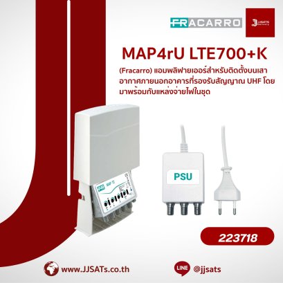 Fracarro MAP4rU LTE700+K (223718) KIT with power supply 1-input (UHF) mast amplifier with 42dB gain and up to 116dBμV output level on UHF band, gain adjustment 0-15dB and low noise figure. 694MHz 5G and 4G LTE integrated filter.