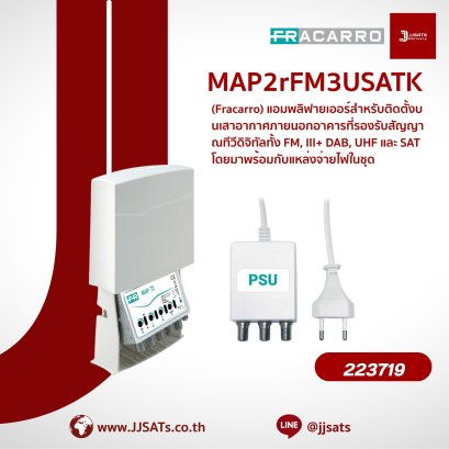 Fracarro MAP2rFM3USATK (223719) KIT with power supply Amplifier with 4 inputs (FM, III+DAB, UHF, SAT) pole mount with 25dB gain and output level up to 116dBμV in UHF band, separate VHF/UHF amplifications, independent gain adjustments (0-15dB) for each input and low noise figure. Power supply included in the package.