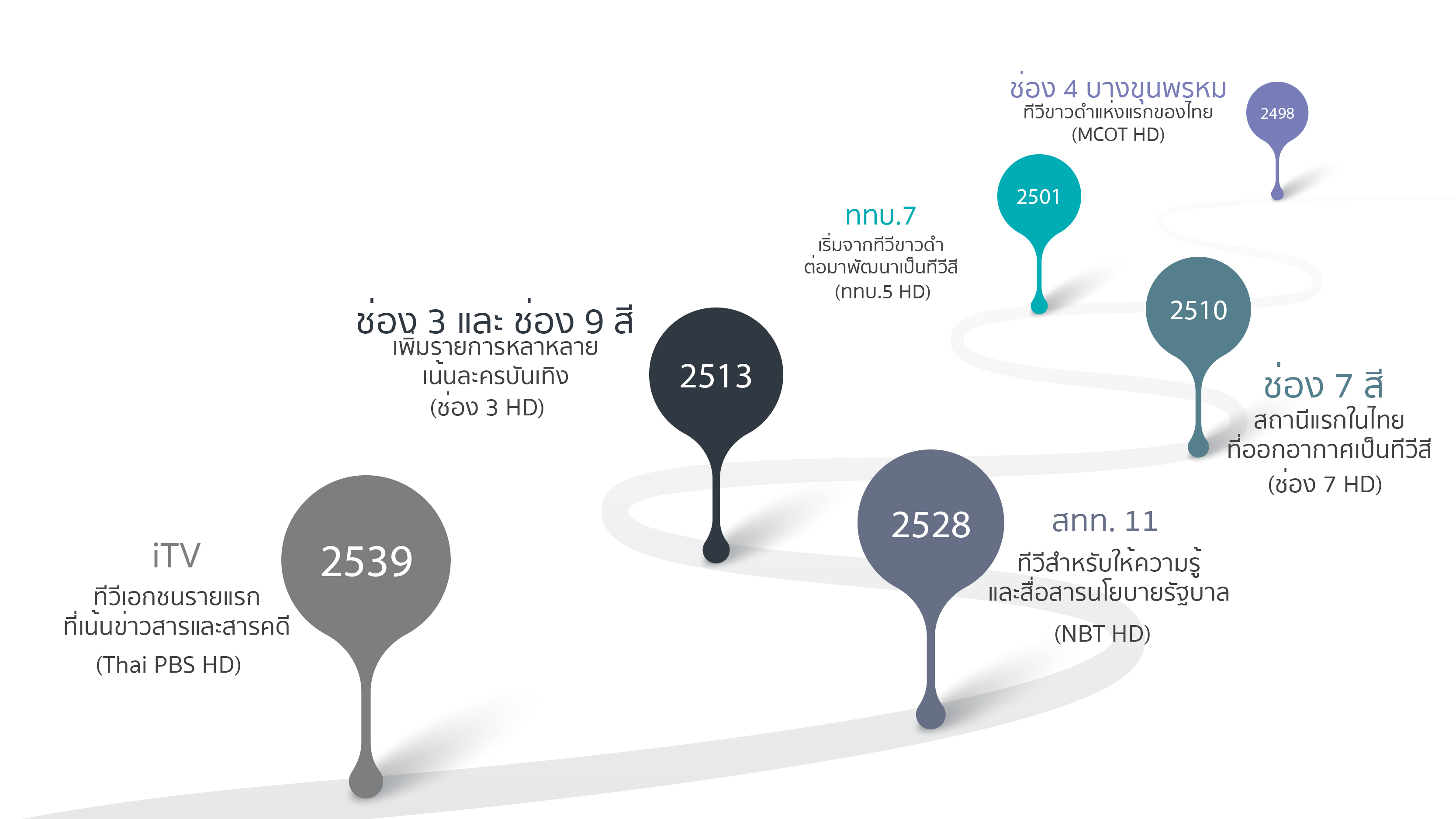 1954: Thai TV Channel 4 Bang Khun Phrom was established as Thailand’s first television station. It officially began black-and-white broadcasts on June 24, 1955. The station later rebranded to Thai TV Color Channel 9 under MCOT on April 9, 1977, and was renamed Channel 9 MCOT HD on April 1, 2014.