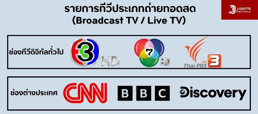 Broadcast TV or Live TV is aired according to a schedule. Viewers must watch programs at their scheduled broadcast times, such as general digital TV channels (Channel 3, Channel 7, ThaiPBS, etc.) and international channels like HBO, Cinemax, CNN, BBC, Discovery, ESPN, etc.