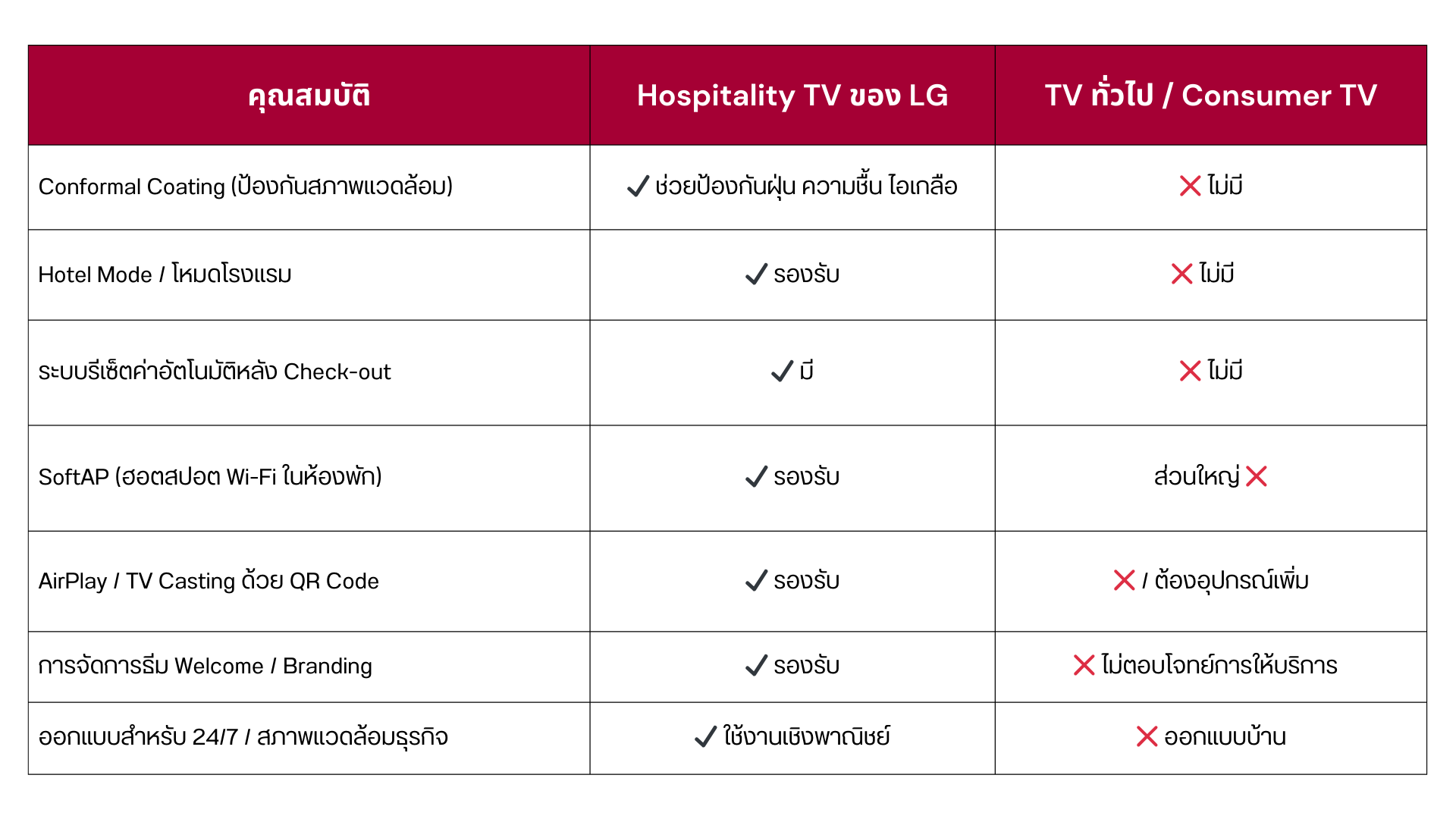 In addition to Conformal Coating, LG Hospitality TVs include business-oriented features such as Hotel Mode, which allows operators to define default settings and lock system configurations to prevent unauthorized changes. They also support SoftAP, enabling the TV to function as an in-room Wi-Fi hotspot, as well as content streaming via AirPlay or TV Casting using QR code authentication. User data can be automatically reset upon guest check-out, ensuring privacy protection in accordance with hospitality industry standards.
