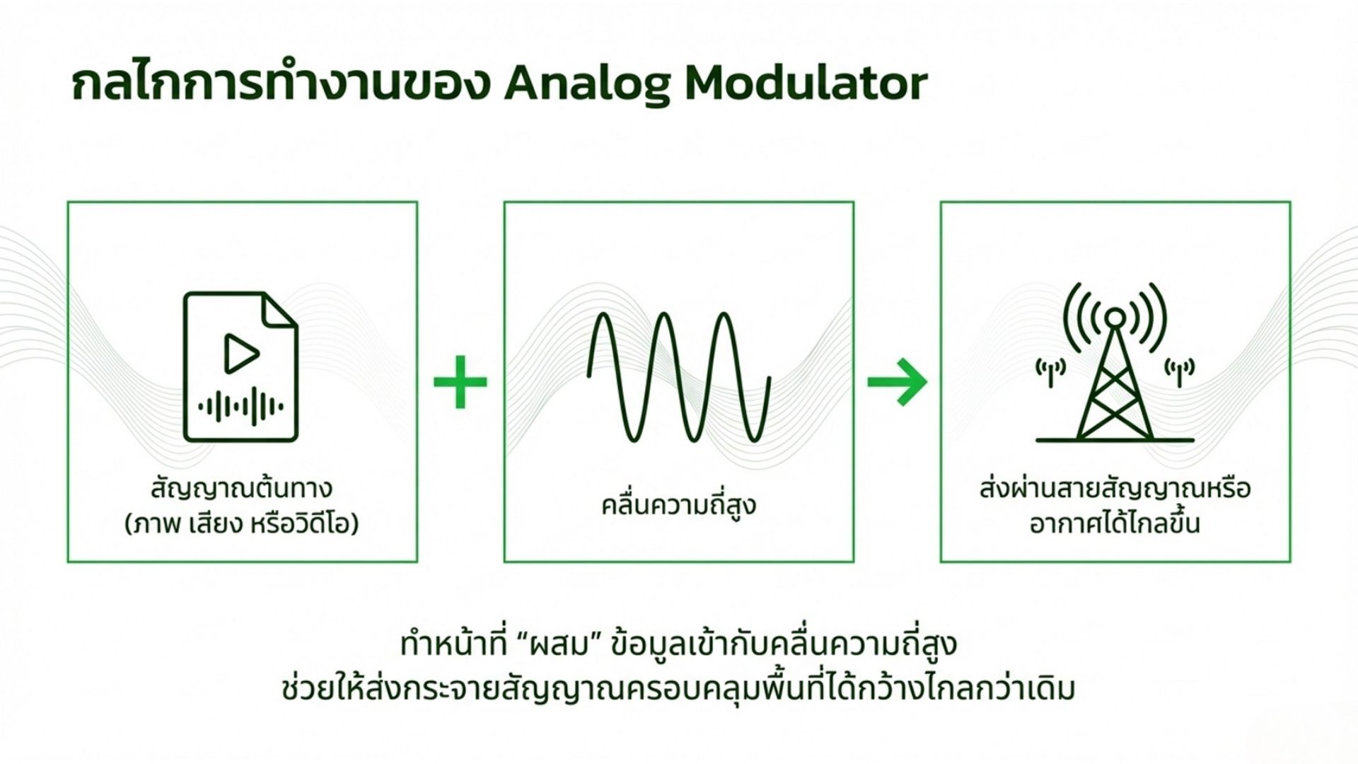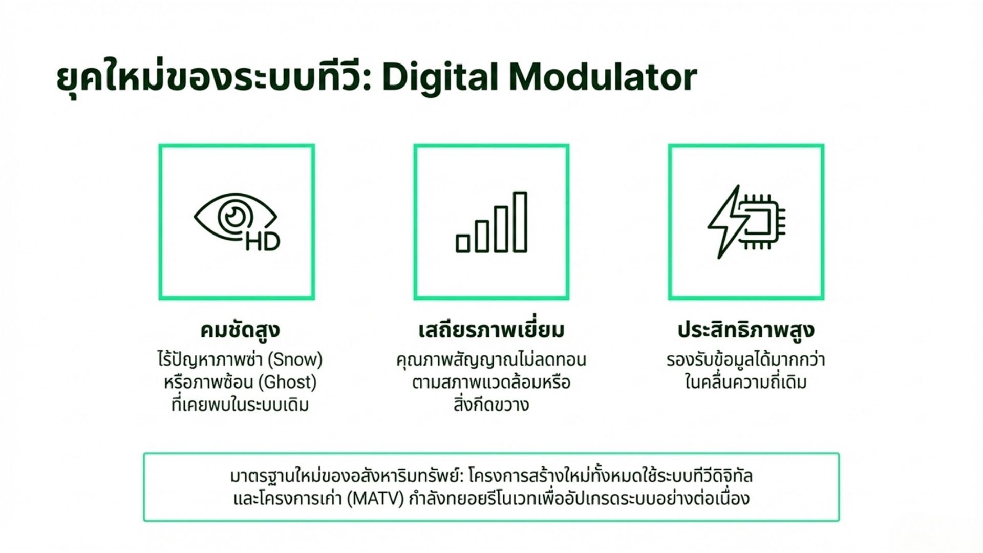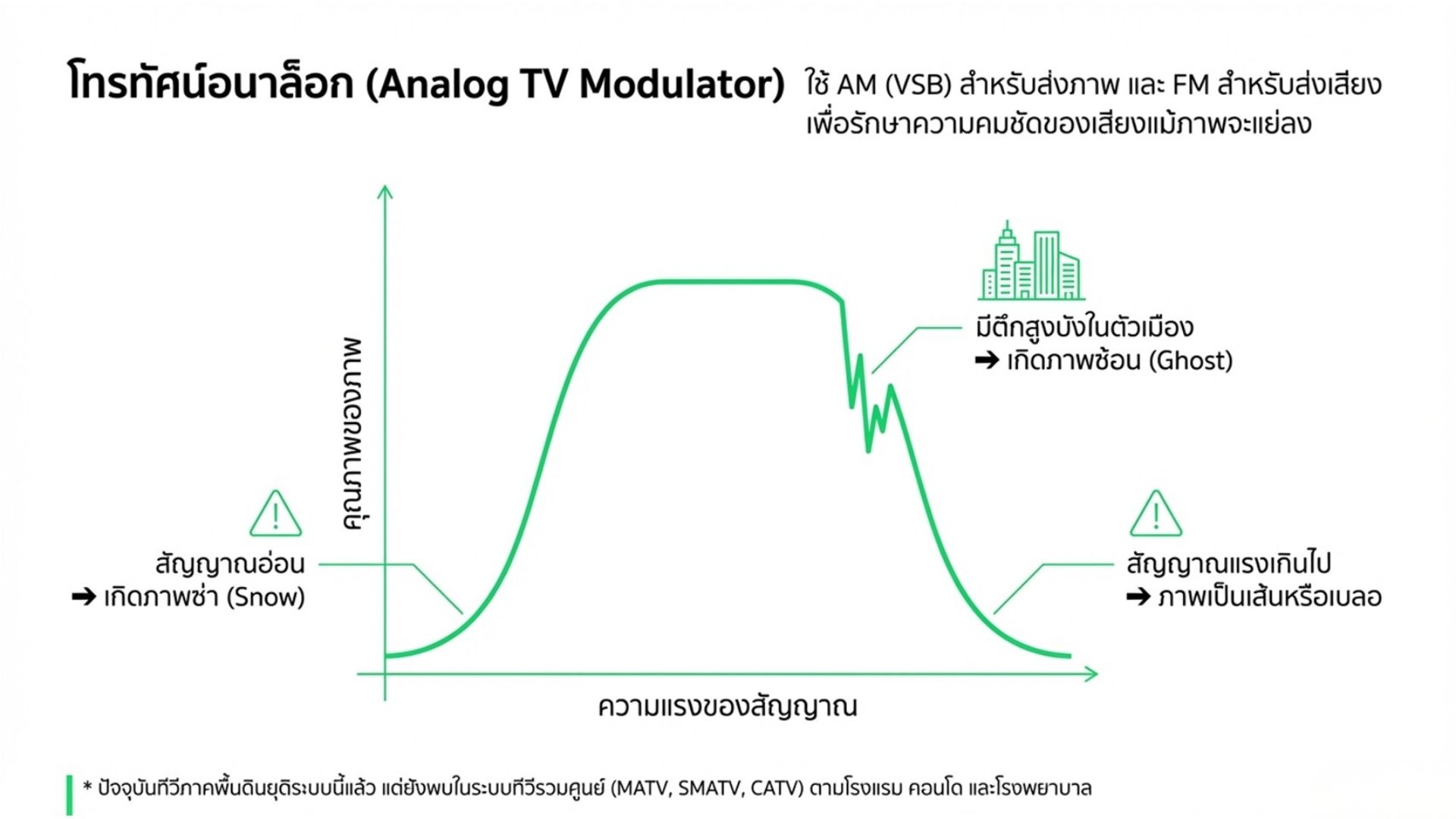• Analog TV uses Analog TV Modulators. Although terrestrial analog broadcasting has ended in Thailand, it is still used in systems like MATV, SMATV, and CATV in hotels, hospitals, and buildings.