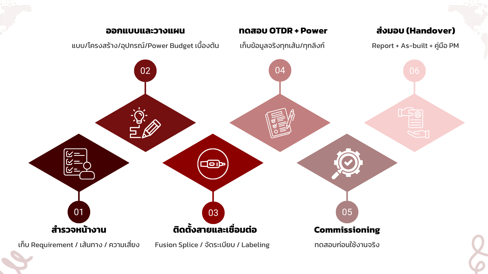JJSATS is a specialist in comprehensive fiber optic network systems. Our services range from design, structure planning and cabling, selecting the most appropriate equipment in accordance with international standards, to installation (Implementation) and maintenance (PM & CM) for both indoor and outdoor work. We employ the correct technical wiring and connection using high-standard equipment, including testing and commissioning to control quality, detect signal loss, and confirm system stability before handover. We also provide comprehensive documentation, wiring diagrams, and maintenance manuals. JJSATS provides services across a wide range of industries, including ISPs and LAN networks.